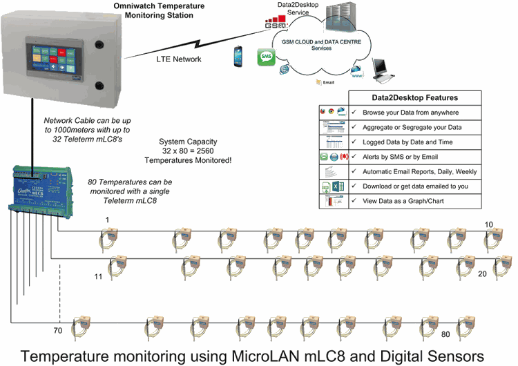 Omniflex has developed a cost-effective solution for applications that need larger temperature coverage, easy onsite configuration and a simple connection system that does not require expensive expertise to apply and maintain. This solution provides a front-end device – the Teleterm mLC8 – which supports up to 80 digital temperature sensors using the Omniflex microLAN network.