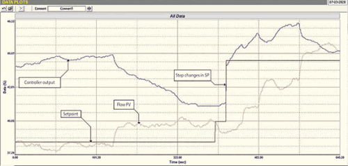 At about 6 minutes into the test, we made quite a large step up in SP and the flow did respond but slowly, showing that the tuning was very bad. It overshot SP and was starting to creep back again when we ended the test. All in all, the test shows that something is strange going on with the flow drifting around.