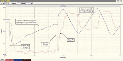 Stick-slip cycles are one of the most misunderstood phenomena in feedback control. The vast majority of people believe that they are due to bad tuning. What they then do is to slow the tuning down until the cycle stops. Now, as I have said many times before, you can always stop a loop cycling by putting it in manual, which could be said to be the infinitely slowest tune. Therefore if you slow the tuning down enough, the cycle will stop, but then you are no longer really controlling, as can be seen in the as found closed loop test in Figure 1.