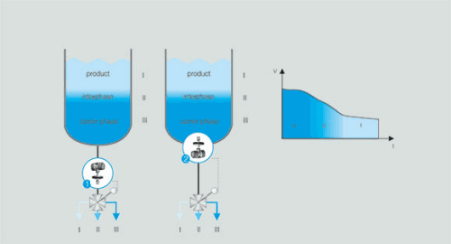 In the petrochemical industry, different product phases must be safely separated from carrier phases. This is done in both continuous procedures and in batch processes. It is often realized in batch processes by the manual switching of valves as well as visual observation of phase transitions (inspection glasses). This approach is, however, marred by unreliability.