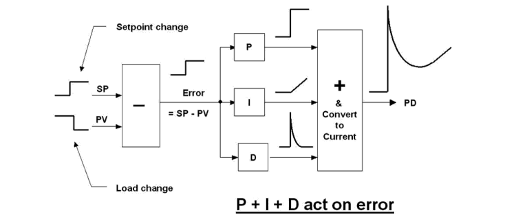 A simple controller complete with all three parameters, P, I and D is shown in Figure 1. As shown in the figure, if a setpoint step change was made, an error signal would appear on the output of the subtraction block. Alternatively an identical error signal would occur if the PV changed in a step of equal magnitude, but in the opposite direction. (A change in PV due to an effect in the process not caused by the controller is known as a load change.) The step in error would then go through the controller and would be acted on simultaneously by all three