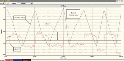 Stick-slip cycles are one of the most misunderstood phenomena in feedback control. The vast majority of people believe that they are due to bad tuning. What they then do is to slow the tuning down until the cycle stops. Now, as I have said many times before, you can always stop a loop cycling by putting it in manual, which could be said to be the infinitely slowest tune. Therefore if you slow the tuning down enough, the cycle will stop, but then you are no longer really controlling, as can be seen in the as found closed loop test in Figure 1.