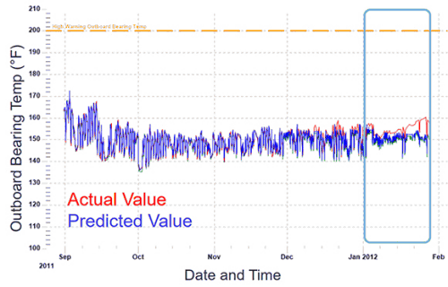 Should an anomaly be detected, the system will raise an alarm, notification or alert to the appropriate users. It also offers advanced analysis capabilities for problem identification and root cause analysis. Figure 1 shows where a ‘current’ value started deviating from the ‘predicted’ value, identifying an anomaly well in advance of the equipment failure.