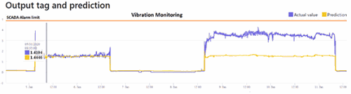 A classic way of doing predictive maintenance on large rotating equipment such as a pump is to use vibration monitoring. Figure 3 shows the actual values of the vibration monitoring coming from the pump motor in blue, with the ‘predicted’ or expected values displayed in yellow. The scada alarm limit is also shown as the orange line. One can clearly see that the IML tool picked up an anomaly in vibration even though vibration was still below the normal alarm limit.
