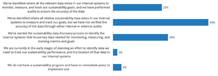 When asked about the current state of the organisation’s sustainability programme in terms of access to and use of required data in IDC’s Future of Enterprise Resilience Survey Europe, in early 2022, only 23% of the manufacturing, utilities, and oil and gas companies had identified all the relevant sustainability data that exists within their internal systems and had performed audits to ensure the accuracy of the data