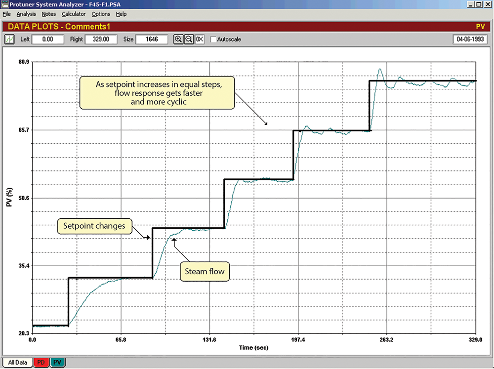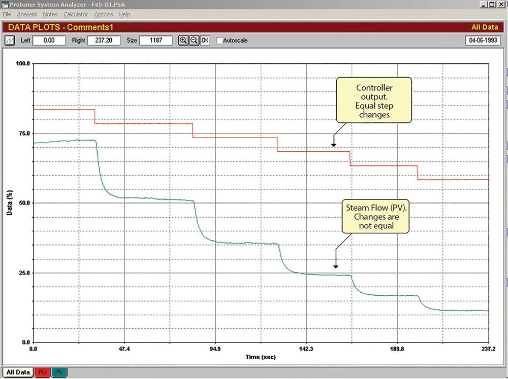 The product of process gain times controller gain (PG x KP) is the main factor that contributes to a controller response to a setpoint or load change. Thus, if the process gain changes, the response will change. This is illustrated in Figure 1, which shows part of an open loop test on a steam flow loop in a large South African petrochemical refinery. As the output of the controller is decreased in equal increments, the steam flow decreases in steps getting smaller and smaller. It is a good example of a non-inear installed characteristic.