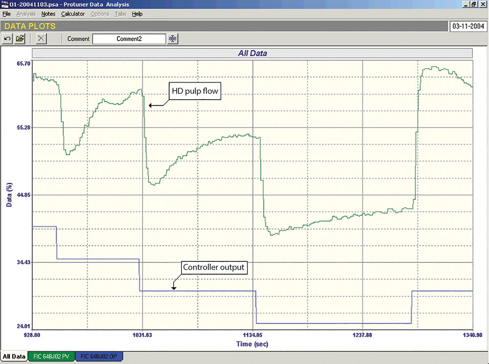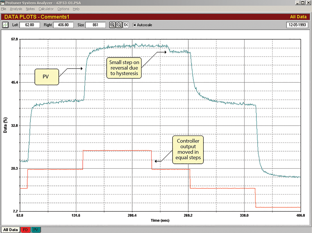 Dynamic nonlinearities can also be encountered in processes that respond differently to differing sizes of changes. For example, I have encountered some very strange responses in certain cases of flows of high-density pulp in paper mills. The recording shown in Figure 4 was taken recently during a course at a tissue mill. Equal step changes on the process demand (PD) showed different responses at different places, and also when the valve was moving in different directions. Initially, one would suspect that the valve has severe problems. However, after further tests on the plant, it was decided that the valve was in fact operating properly, and that the strange and differing responses were being caused by consistency changes in the pulp when subjected to step changes. Making very small changes on the PD, and using these for tuning, resolved the problem. This is quite valid because in normal operation the flow is being kept constant, and the control is there to deal with load changes, which on the whole are very small.