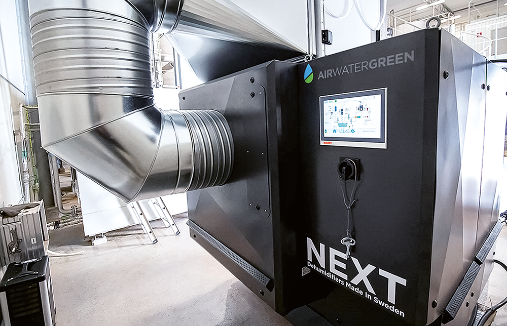Airwatergreen specialises in indoor climate solutions that reduce energy consumption by between 30 to 70% compared to conventional technologies. Its CVP technology works with a liquid drying agent and uses the principle of absorbing water vapour from the air. The temperature and concentration of the solution, i.e., its vapour pressure, determine its ability to extract water vapour from the air or to add it in. The concentration can be regulated so that when the device releases the air it has previously drawn in, it has a relative humidity of between 30 and 90%. “Our technology generates the optimum air quality in terms of humidity directly in the production hall or warehouse, eliminating the need for complicated evacuation systems,” explains Bo Tiderman, CEO of Airwatergreen.