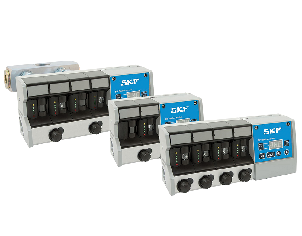 SKF recommended that the customer upgrade to SKF Flowline Monitor oil meters with integrated monitoring, which provides continuous oversight and control of the oil circulation lubrication systems. The SKF Flowline Monitor divides, measures and controls the flow rate in oil circulation lubrication systems. The series includes three models − FL15, FL50 and FL100. These deliver three different flow meter sizes, covering flow rates from 0,1 to 100 l/min and handling operating viscosities between 32 and 1000 mm²/s. Featuring operating pressures up to 16 bar, each meter operates independently, and can be programmed and adjusted separately for precise control. With an operating temperature range of 0 to 65°C and an IP65 rating, the SKF Flowline Monitor delivers accurate measurements, irrespective of variations in oil temperature and viscosity. It supports computer configuration and remote monitoring, while optional monitoring modules provide common alarms, individual alarms for each lubrication point and interfaces to process control systems.