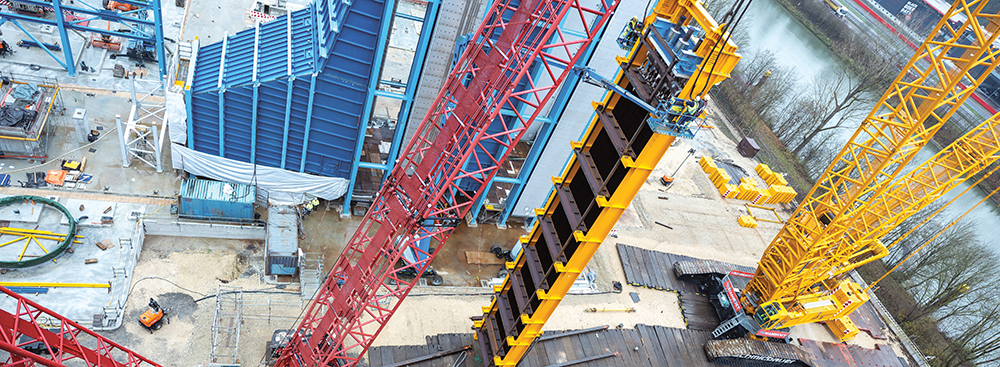 Two crawler cranes, a main 1350 ton crane and a 600 ton tailing crane, were utilised to tail up the HRSG modules from a horizontal to a vertical position. Additionally, the modules had to be lifted over the top of a building. Due to the extended length of the crane’s boom, clearance was required from Stuttgart Airport to execute the lift.