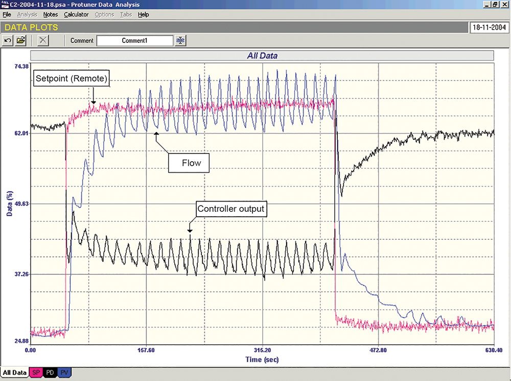 Figure 1 illustrates such a case that was recorded recently at a power station. The loop in question is a cascade flow secondary whose setpoint is the output of the level controller in a large tank. Under certain circumstances, the flow to the tank is doubled when opening a second line. It has a similar effect as if a second pump had been started. As soon as this happens, the setpoint is immediately increased substantially. It can be seen how the flow starts oscillating. This is most likely to be due to a virtual doubling in process gain, without changing the tuning. The cycling ceased as soon as the flow was reduced again, and setpoint taken back down.