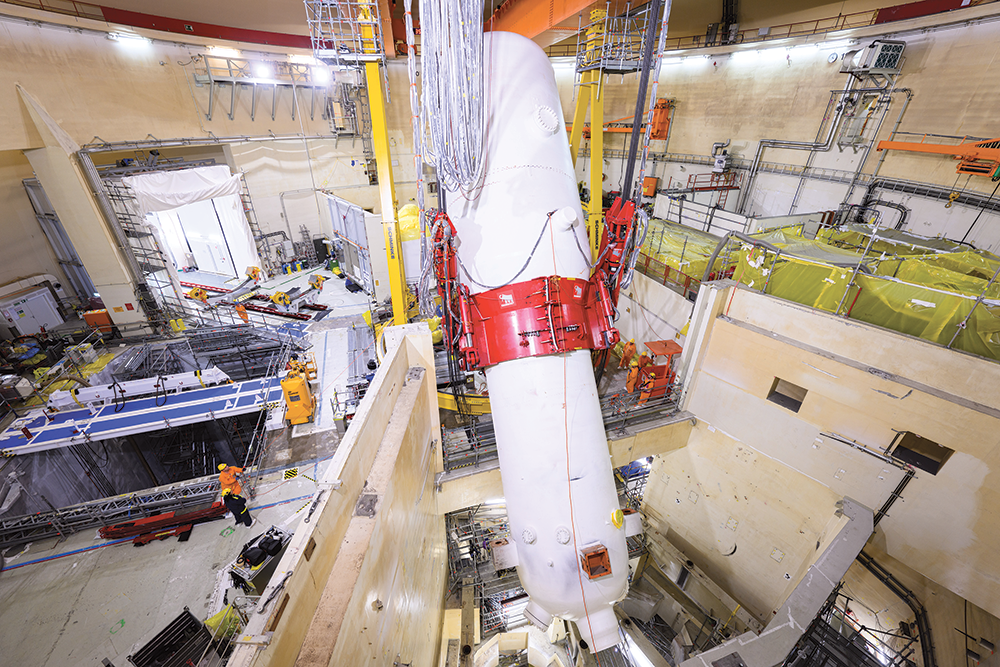 The DHS-500, which can be customised to the conditions of a building, comprises a top spreader beam that can be bolt-fastened to the hook of overhead cranes using an adjustable ring designed to grip the cylindrical steam generators. Another benefit of the system is that the tilting and pivot point can be adjusted to the centre of gravity by using a hydraulic cylinder, providing the tilting operation with much greater stability and safety.