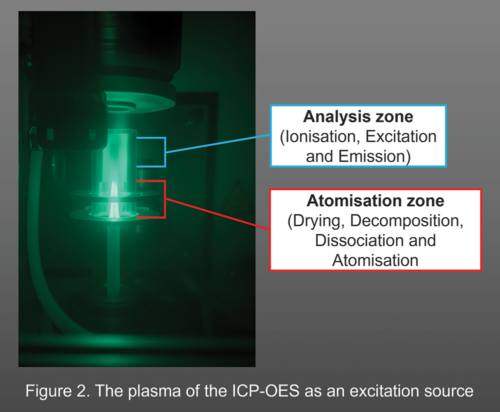 In the sample introduction stage, the diluted sample is pumped into a nebuliser to reduce the sample liquid into a fine mist (aerosol). The aerosol is introduced into a high-energy plasma excitation source, the ICP torch, to decompose, dry and atomise the oil sample. Spontaneous emission of characteristic wavelengths of light occurs, which are then detected for quantification.
