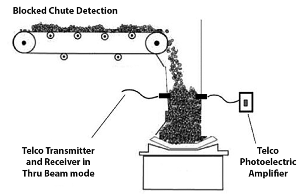 Blocked or empty chute is a common application in industry for hopper/crusher detection. The Telco Sensors system used for blocked chute detection consists of a PA 11 amplifier with transmitter (LT) and receivers (LR). Sensing ranges from 18 to 40 to 70 metres, with enough power to ‘see through’ buildup contamination. A hole is drilled through the chute on either side so the transmitter and receiver can be mounted in through beam mode, out of the product stream and at the desired height to prevent buildup that could damage the conveyor belt.
