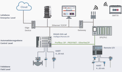 Many sensors, e.g. Endress+Hauser flowmeters not only provide the actual measured value, such as flow rate, but also temperature values, density, condensate, etc. using the HART protocol. Here, the RSG45 DIN is in its element. As an intelligent HART gateway it can pre-process values, perform calculations, and link them together. The measured data or results are then transferred via fieldbus or Ethernet. Device connectivity and the provision for further data processing are the basis for future solutions and cloud-based data management.