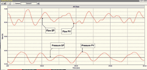 The flow is measured and controlled via a magnetic flowmeter and variable speed pump. The pressure is measured downstream and a certain amount of fluid is recirculated via a control valve to keep the pressure into the plant at a desired value. This is not an uncommon type of control strategy, but in this case, as quite a large amount of fluid was being recirculated under the running conditions, the two controls were highly interactive. This resulted in a continuous cycle of both the flow and pressure variables, with each of them cycling with a period of approximately 100 seconds and cycle amplitudes of about 10%. This was hitting all the numerous other processes downstream and creating bad production. The recording of the ‘as found’ test is shown in Figure 2.