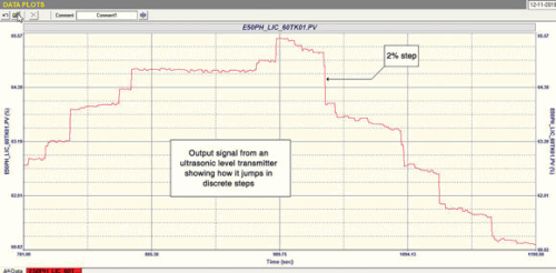 The next major problem we found on the system was spikes in flow on the output of tanks in which the level was being controlled. We found this not to be due to tuning or valve problems, but caused by the measuring transmitters of the ultrasonic type.