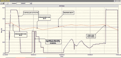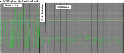 Figure 3 is a screenshot taken from the actual control system’s trends package which shows the performance before and after the optimisation exercise. (The green line is the PD (controller’s output) – all in all, another very successful and pleasurable day at the ‘coal face’.