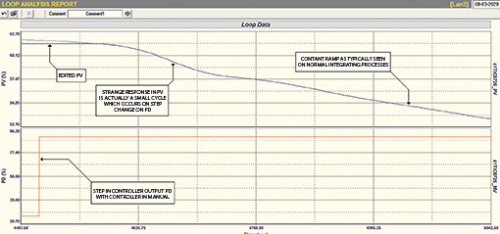 The process was the temperature control of a cooling heat exchanger. Now heat exchangers normally always have self-regulating dynamics. On starting our tests, which mainly had to be performed in manual, we saw that after an hour the PV showed no sign of settling out as normal with a self-regulating process, but continued ramping either up or down depending on the magnitude of the PD. I then managed to get hold of a senior process engineer who explained that the process fluid was actually recycled back to the converter’s hood after passing through the exchanger. Therefore after the pass through the hoods, colder water was coming back to the exchanger, cooling it even further. Therefore the process is integrating.