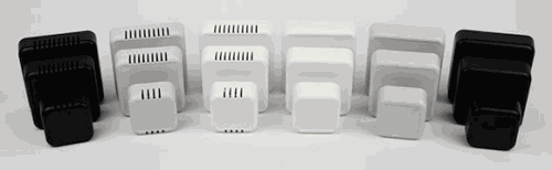 These new enclosures are available in external dimensions: 74 x 74 x 25,5 mm (Size 2) and 51 x 51 x 25,5 mm (Size 3), which sit alongside the existing 86 x 86 x 25,5 mm (Size 1) . All the sizes are available as a vented or solid option and offered in three standard colours: white, black or grey.