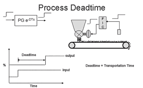 Deadtime in a process is defined as the amount of time after a change is made in the input to the process before there is any change in the process output measurement. Deadtime in processes are typically the result of transportation delay. Figure 1 depicts a mass feeder conveyor, where the belt is moving at a given rate. The process deadtime is the time taken from when the material leaves the hopper until it reaches the measurement transmitter. Processes with long deadtimes compared to the process time lags, require relatively fast integral times and very small proportional gains in the controllers.