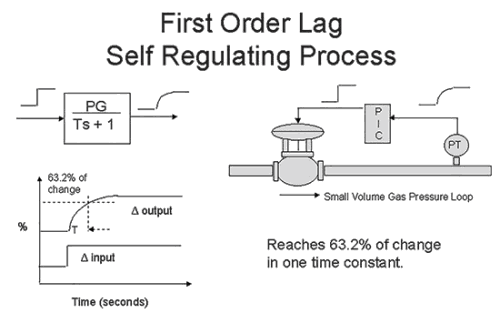 A first order lag is illustrated in Figure 2. It is an exponential response to a step change on the process input. The lag is measured by its ‘time constant’. A pure lag reaches 63,2% of its total change in one time constant. The time constant value is not affected by the size of the step.