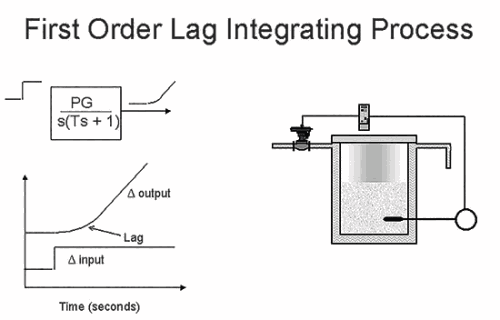 A noteworthy point is that this is one of the only two cases of process dynamics where one should use the D term in the controller. In this particular case, the D can make a really significant improvement to the control response, typically increasing the speed of response by as much as a factor of four. The value of D is set equal to the time constant of the lag, and this effectively cancels the lag, particularly if the controller is using a series algorithm. (See article on controller algorithms later in the series.)