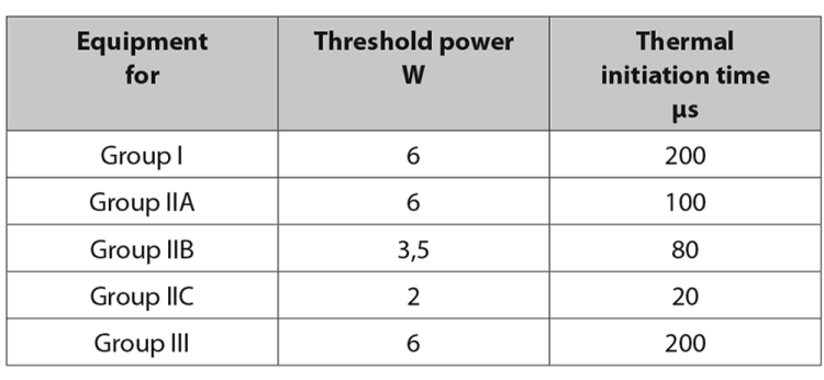 From the standards: Radio Frequency Sources (9 kHz to 60 GHz) for continuous transmissions and pulsed transmissions, whose pulse duration exceed the thermal initiation time, shall not exceed limits below: