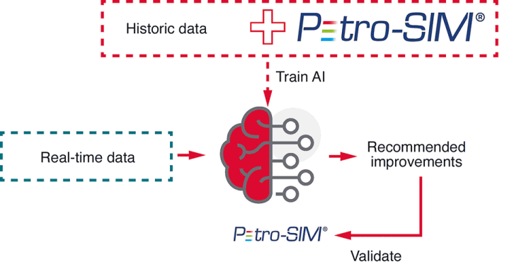 The ‘first principles’ model, in the form of the process digital twin described above, can act as the training ground for a correlation-based AI algorithm. First principles models can explore operating worlds beyond operating windows the plant has experienced and generate valid linearised models for the AI to use in those previously unencountered regions. The combination of synthetic data and plant data to continuously train machine learning algorithms allows real-time solutions to be recommended directly to operators and engineers at the moment of greatest impact. The architecture of such a setup is shown in Figure 2 using Petro-SIM as the first principles analytics package.