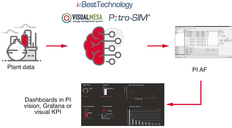 KBC recently implemented a D-EMS with an international oil company that operates multiple refining assets globally. The central energy team needed to drive a consistent approach to energy improvements and sustain its energy performance with a reduced effort. It also looked to the D-EMS to help it facilitate effective capital deployment from the corporate budget. The solution architecture is shown in Figure 3. Measured and calculated values are converted into a PI asset framework (AF), which arranges the data into a certain predefined hierarchy. Dashboards are then generated using the asset framework in any desired dashboarding environment. A standard asset framework and hierarchy makes dashboarding seamless for the end user.
