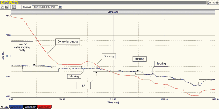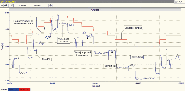 This is one of the most interesting and dramatic examples I have seen of a valve not following the PD signal properly. Luckily, the fluctuations were all in a relatively narrow band, so an average flow control was possible. Another interesting thing is that nobody in the C&I; department was aware of the problem, and all had tried tuning.