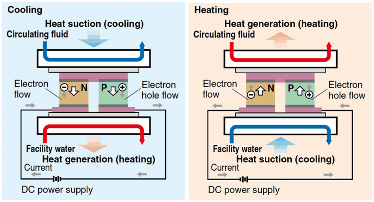 A Peltier device is a plate-type element, inside which P-type semiconductors and N-type semiconductors are layered alternately. Therefore, changing the direction of the current supplied to the Peltier device can achieve heating and cooling operation. Temperature can be controlled precisely because this method has a fast response and can switch quickly from heating to cooling.