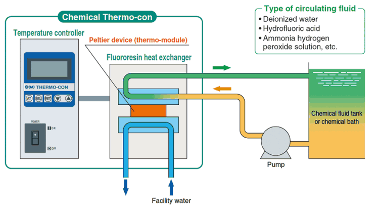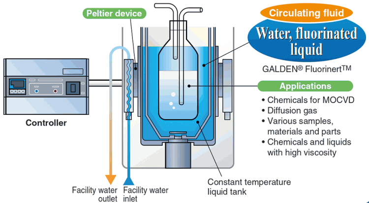This equipment cools the circulating fluid by directly exchanging it with the cooling water in the plant. This can be used at room temperature or higher, and also when there is a cooling water circulation facility. Large-scale heat exchange can be performed using less energy, and the device has a compact body since a compressor is not required. An electric heater is used for heating.