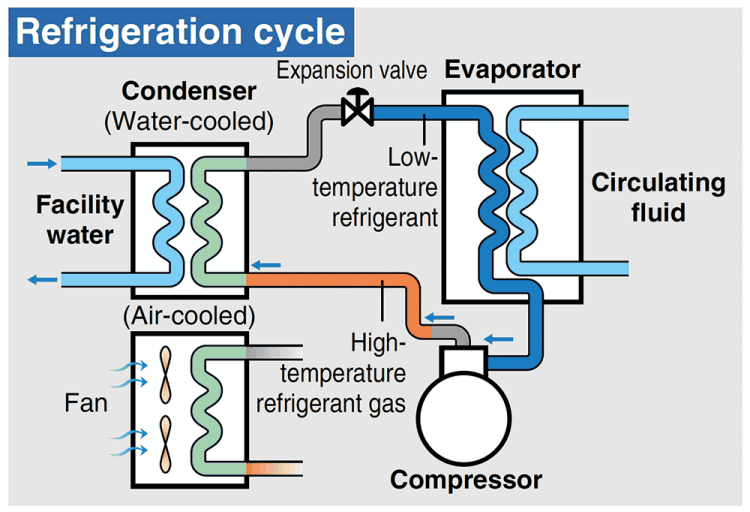 Large-scale heat exchange can be handled compared with the Peltier type. There are two types of heating sources: high-temperature refrigerant gas, which is generated from the refrigeration circuit, and an electric heater. Both air-cooled and water-cooled types are available, depending on the condenser’s cooling method.