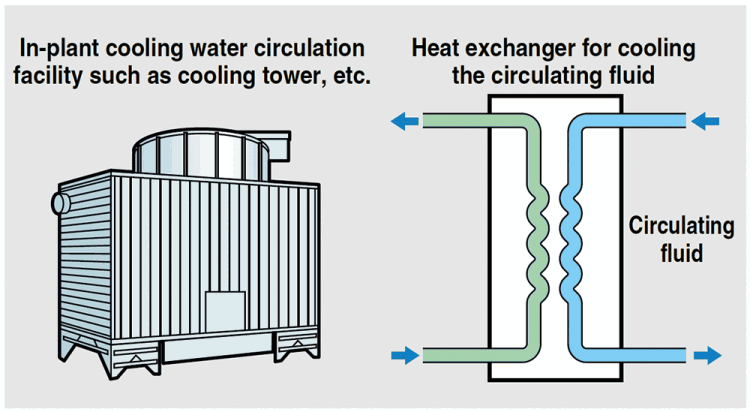 • There is a cooling tower, but high temperatures in summer or low (freezing) temperatures in winter make cooling water temperatures unstable, cooling water at a consistent temperature can be supplied, regardless of the season.