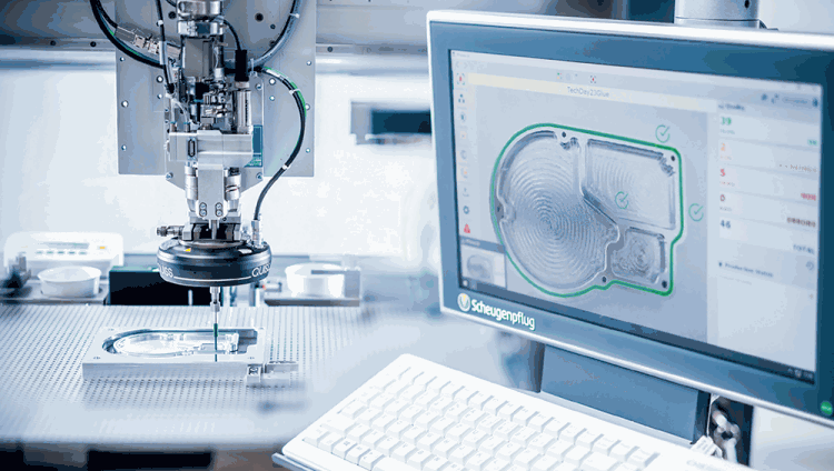 The ProcessModule is also used in the Scheugenpflug DispensingCell DC803 multifunctional cell. This offers the necessary flexibility to implement the increasingly demanding and individual requirements for bonding, sealing and potting processes for medium (40 000 to 200 000) to high (200 000 to 2 million) quantities. The cell is specially designed for series production with short cycle times, particularly in the automotive, industrial electronics and medical technology sectors. In addition to the flexible application options and the integrated additional processes, e.g., for process monitoring, it boasts a high axial load capacity, and intuitive operation and programming of the dispensing processes.